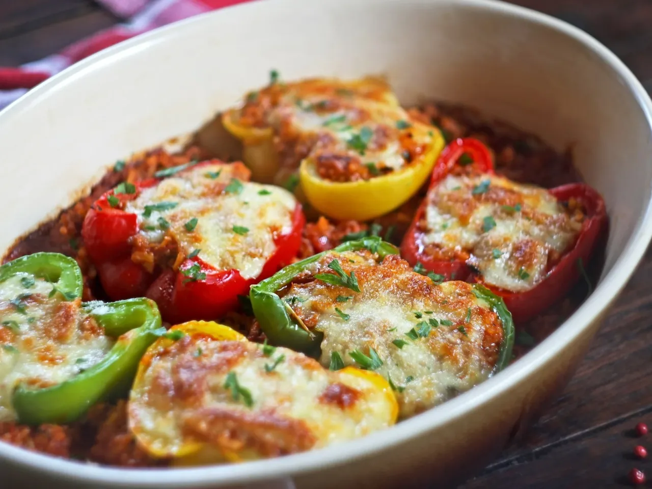 - Faszerowanie: Napełnij papryki przygotowanym farszem, delikatnie go ugniatając. Przykryj papryki odciętymi "czapeczkami".
